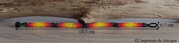 Ce bracelet fin évoque les teintes ardentes du feu à travers un tissage délicat de perles rouges, orangées et dorées. Chaque perle est soigneusement assemblée à la main par Elvia González Carrillo et sa famille.