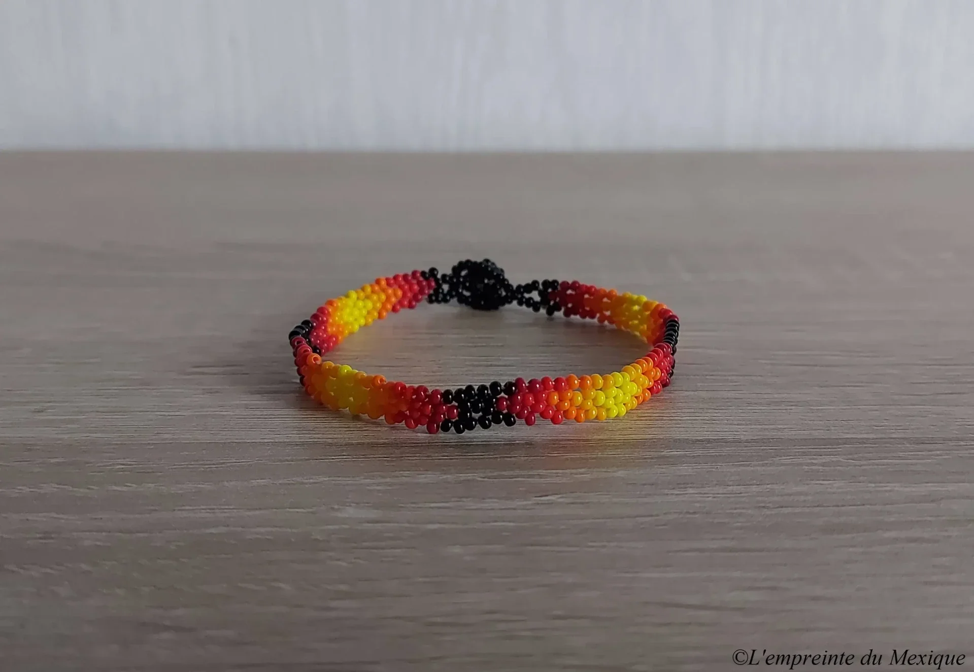 Ce bracelet fin évoque les teintes ardentes du feu à travers un tissage délicat de perles rouges, orangées et dorées. Chaque perle est soigneusement assemblée à la main par Elvia González Carrillo et sa famille.