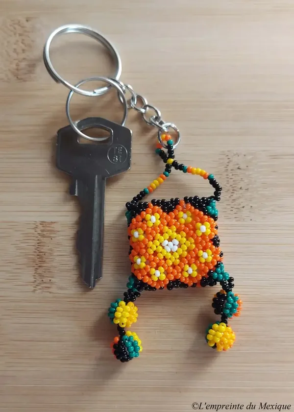 Porte-clés sac orange en perles de chaquira – Art Wixárika