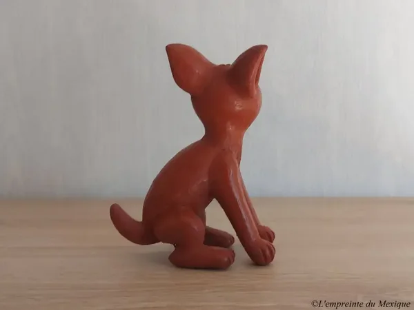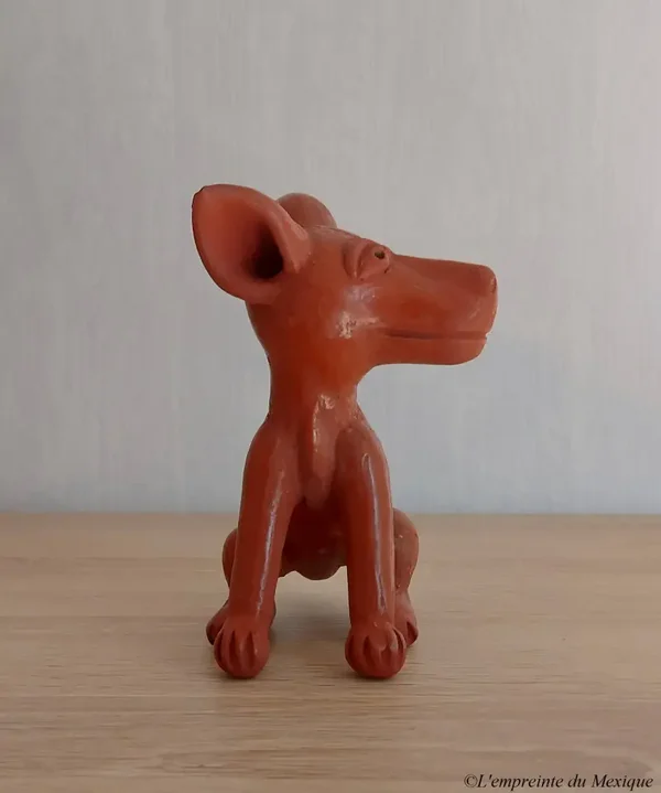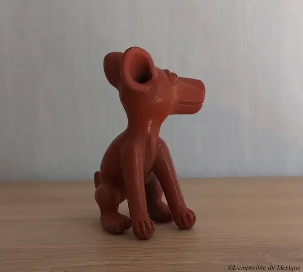 Cette sculpture en terre cuite polie (barro bruñido), façonnée et peinte à la main par Lino Ibarra Ponce de La Casa de Barro, représente un xoloitzcuintle, chien sacré du Mexique. Dans la mythologie Mexica (Aztèque), cet animal guide les âmes dans l’inframonde