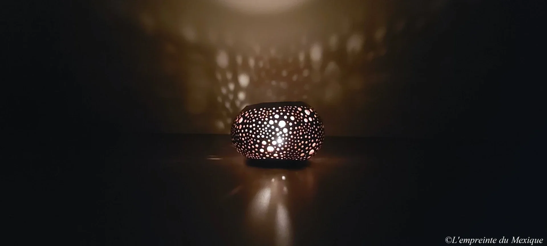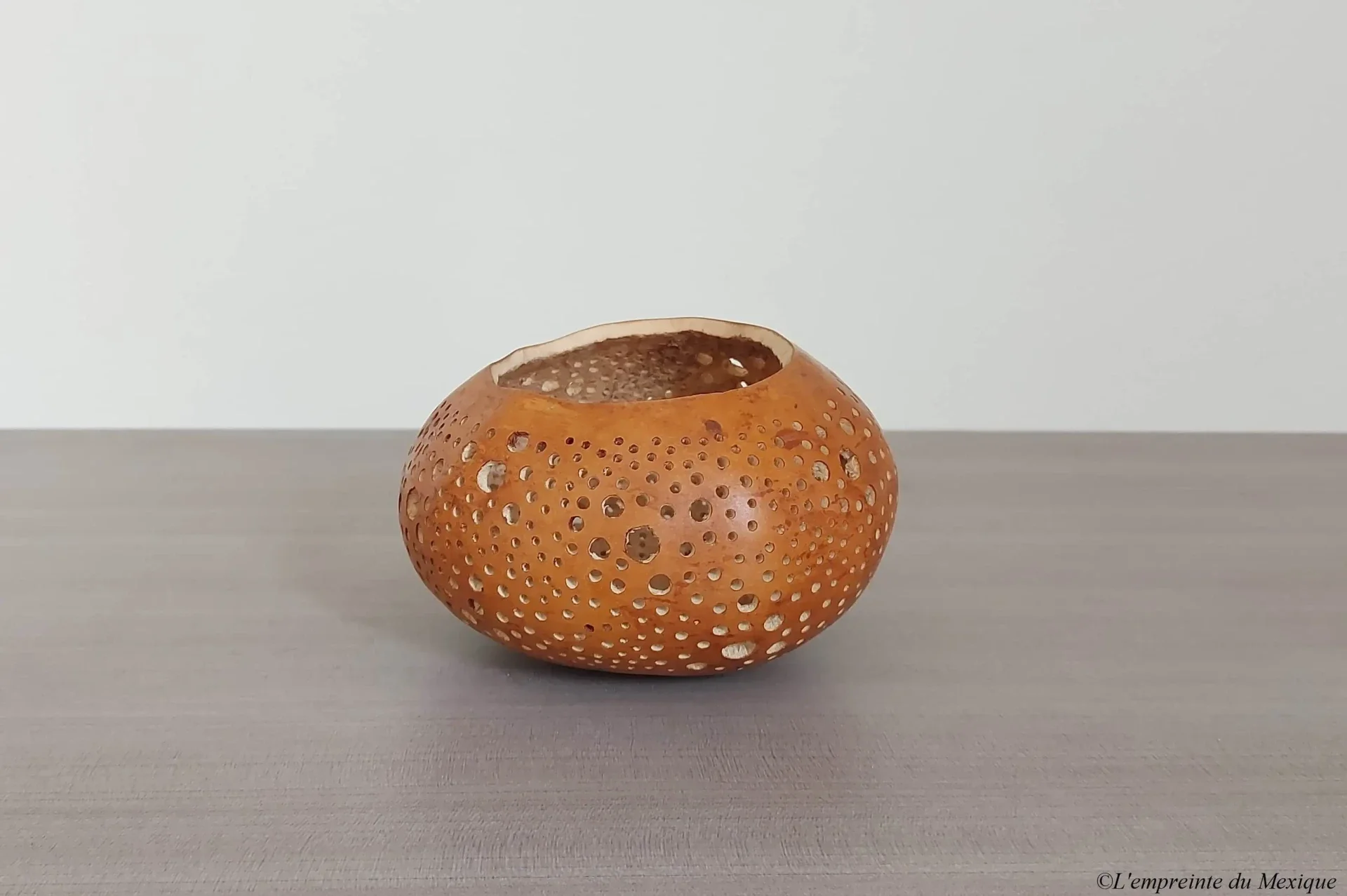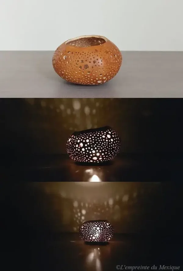 Ce photophore en calebasse sculptée aux motifs en points est une création artisanale signée José Zuñiga M. de l’atelier Arte Natural.