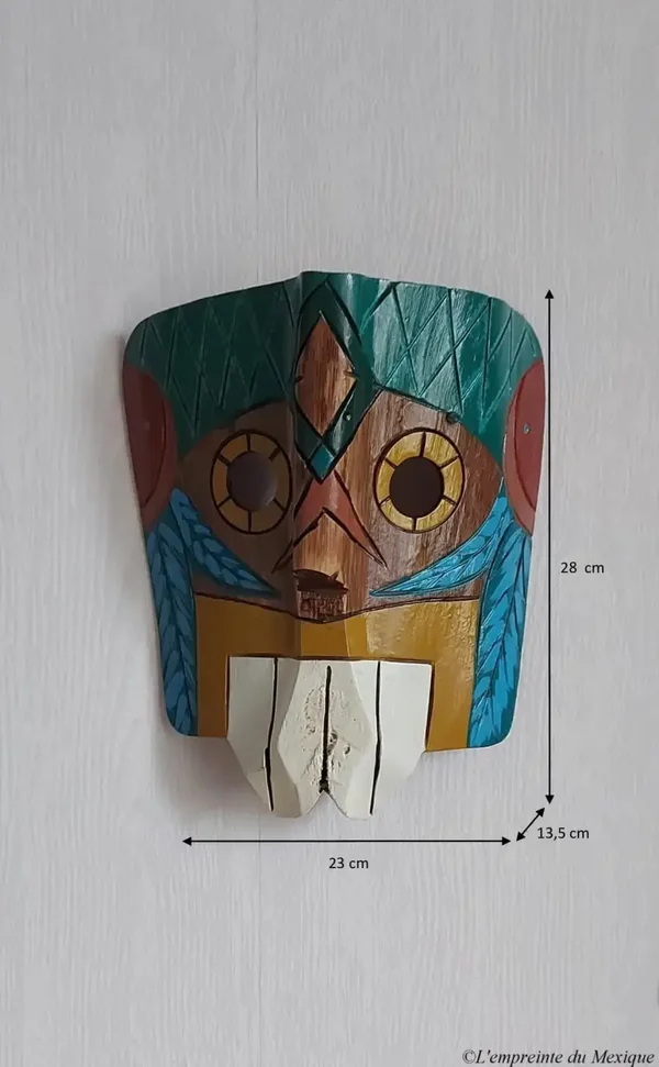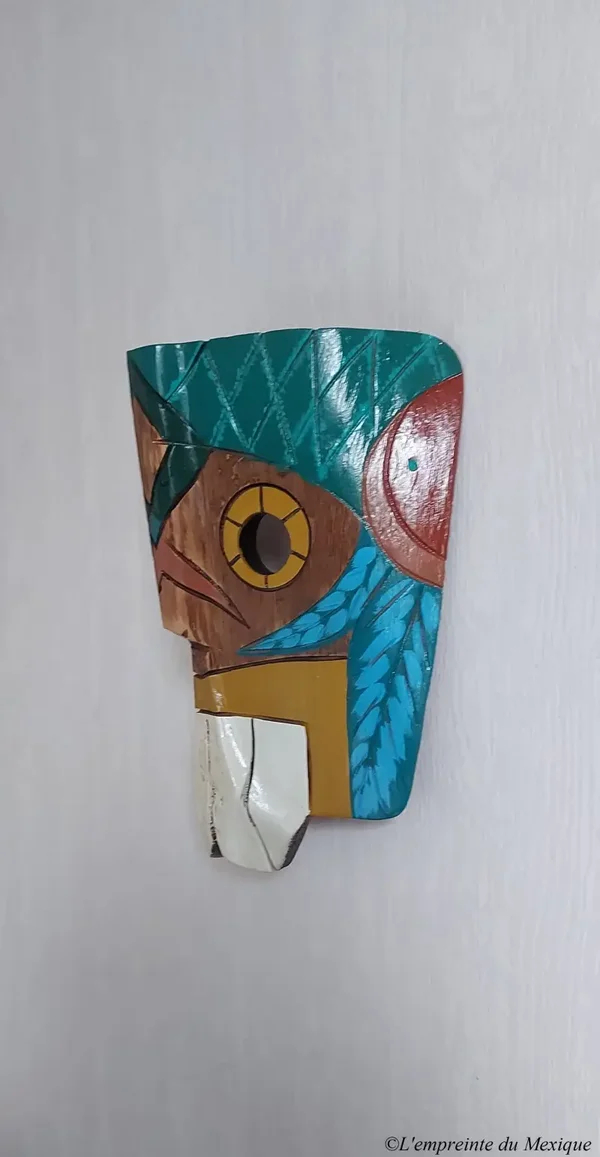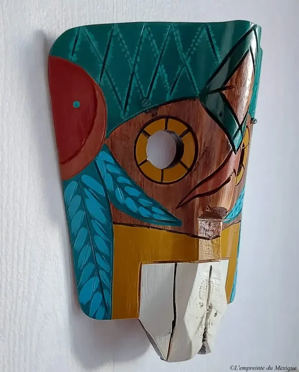 Ce masque mural représente Quetzalcóatl, le célèbre dieu-serpent à plumes des civilisations mésoaméricaines, notamment chez les Mexicas (Aztèques). Symbole de sagesse, de création et de renaissance, Quetzalcóatl est une figure divine majeure, complexe et profondément respectée.