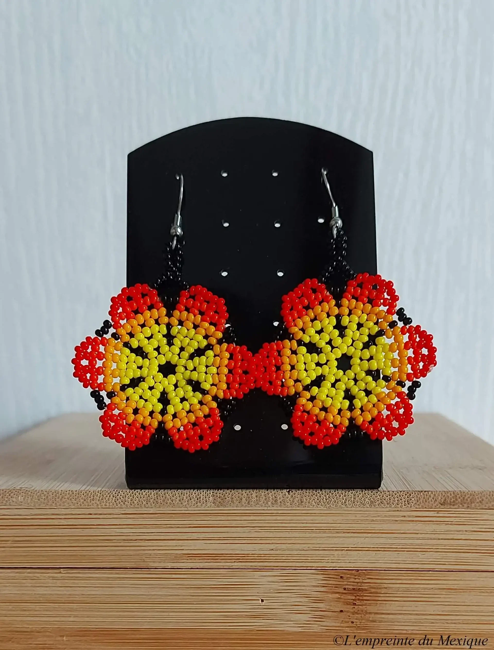 Boucles d’oreilles fleurs de peyotl rouge, orange et jaune en perles de chaquiras – Art Wixárika