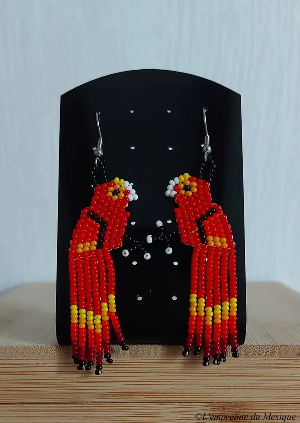 Boucles d’oreilles perroquets rouges en perles de chaquiras – Art Wixárika