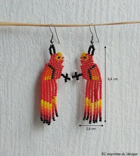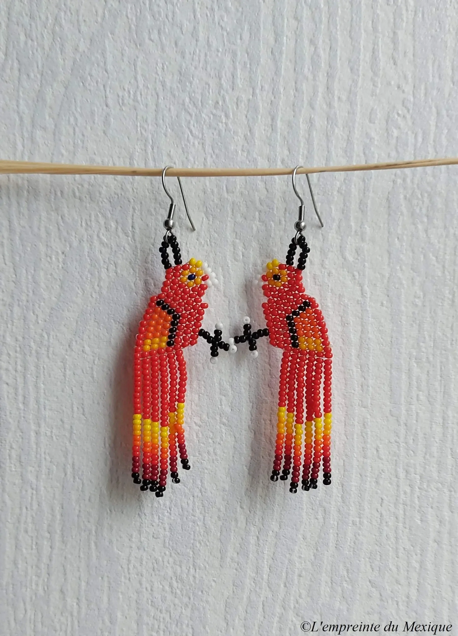Boucles d’oreilles perroquets rouges en perles de chaquiras – Art Wixárika