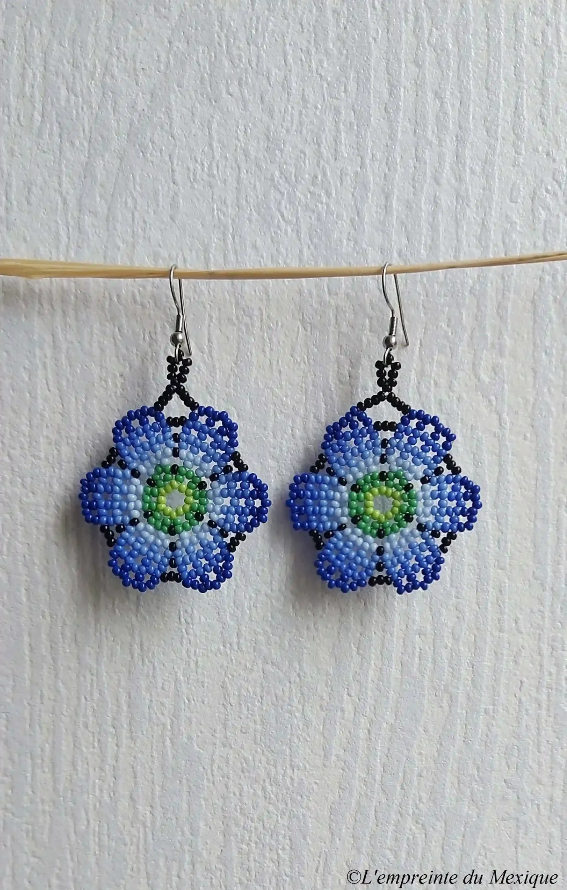 Boucles d’oreilles fleurs de peyotl bleu foncé en perles de chaquiras – Art Wixárika