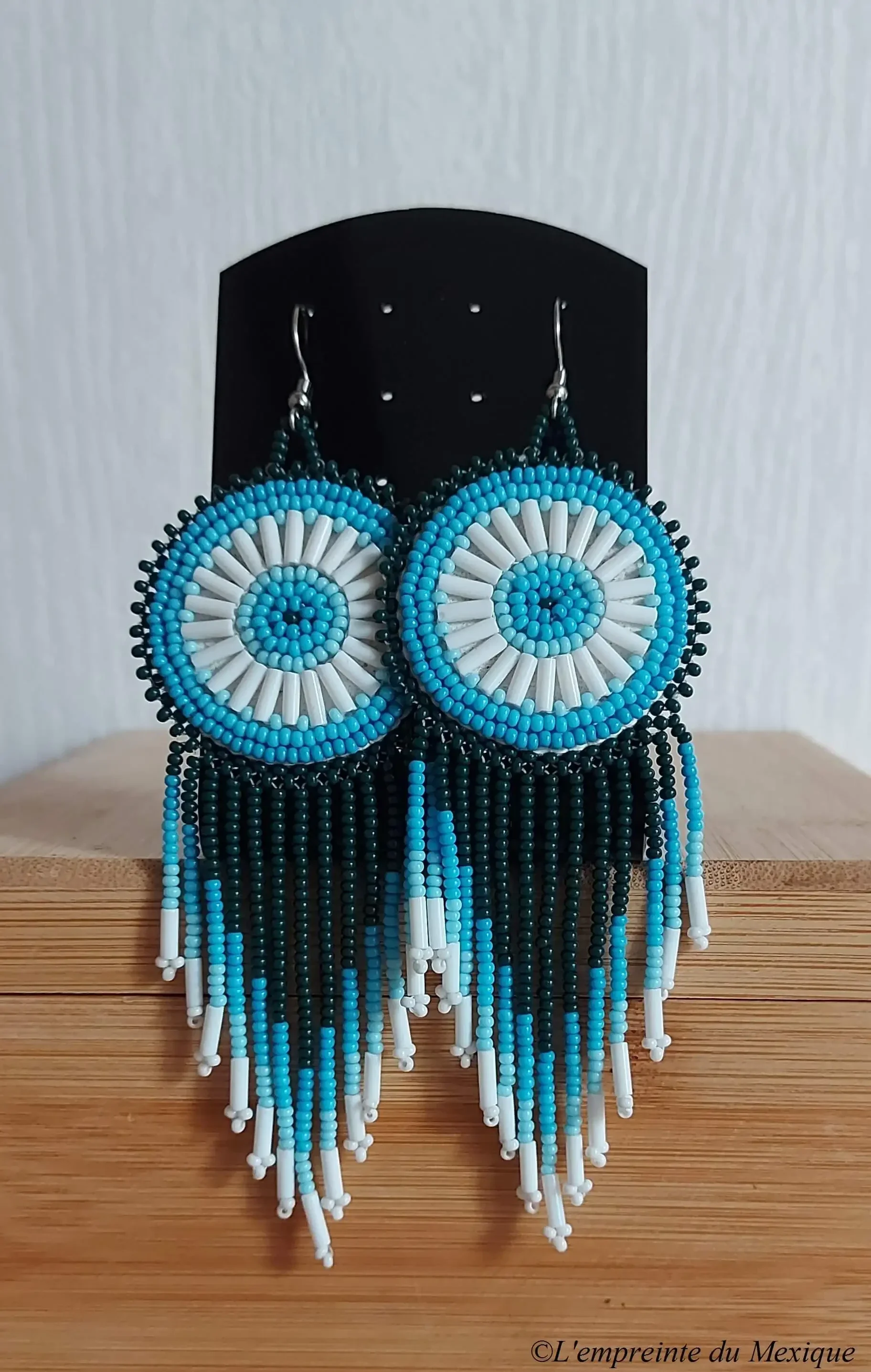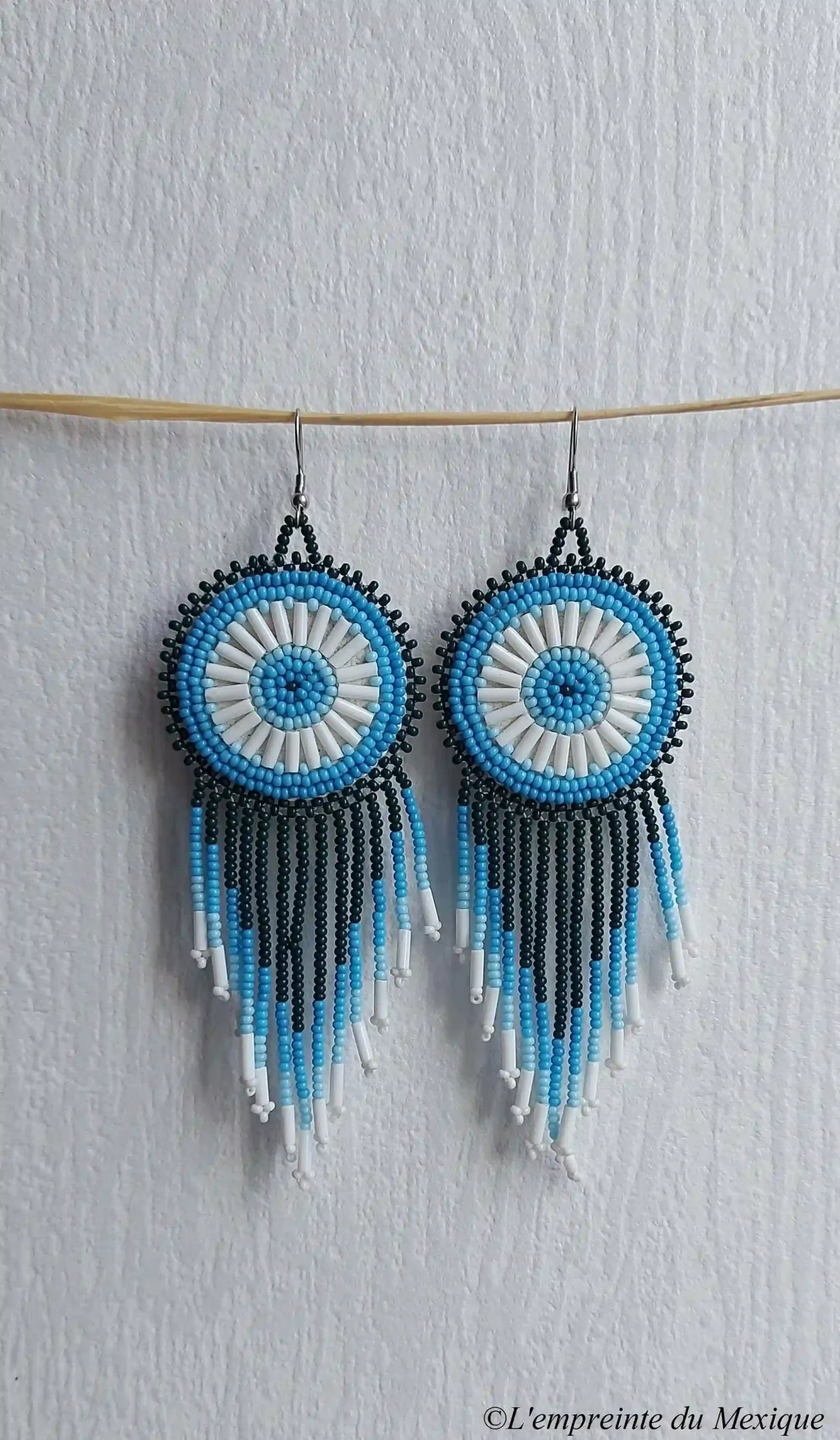 Boucles d’oreilles yoyo bleues en perles de chaquiras et simili-cuir – Art Wixárika