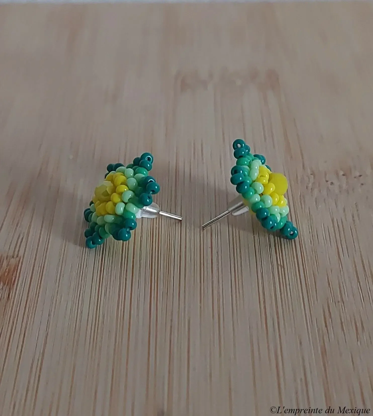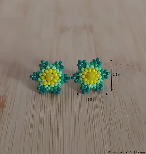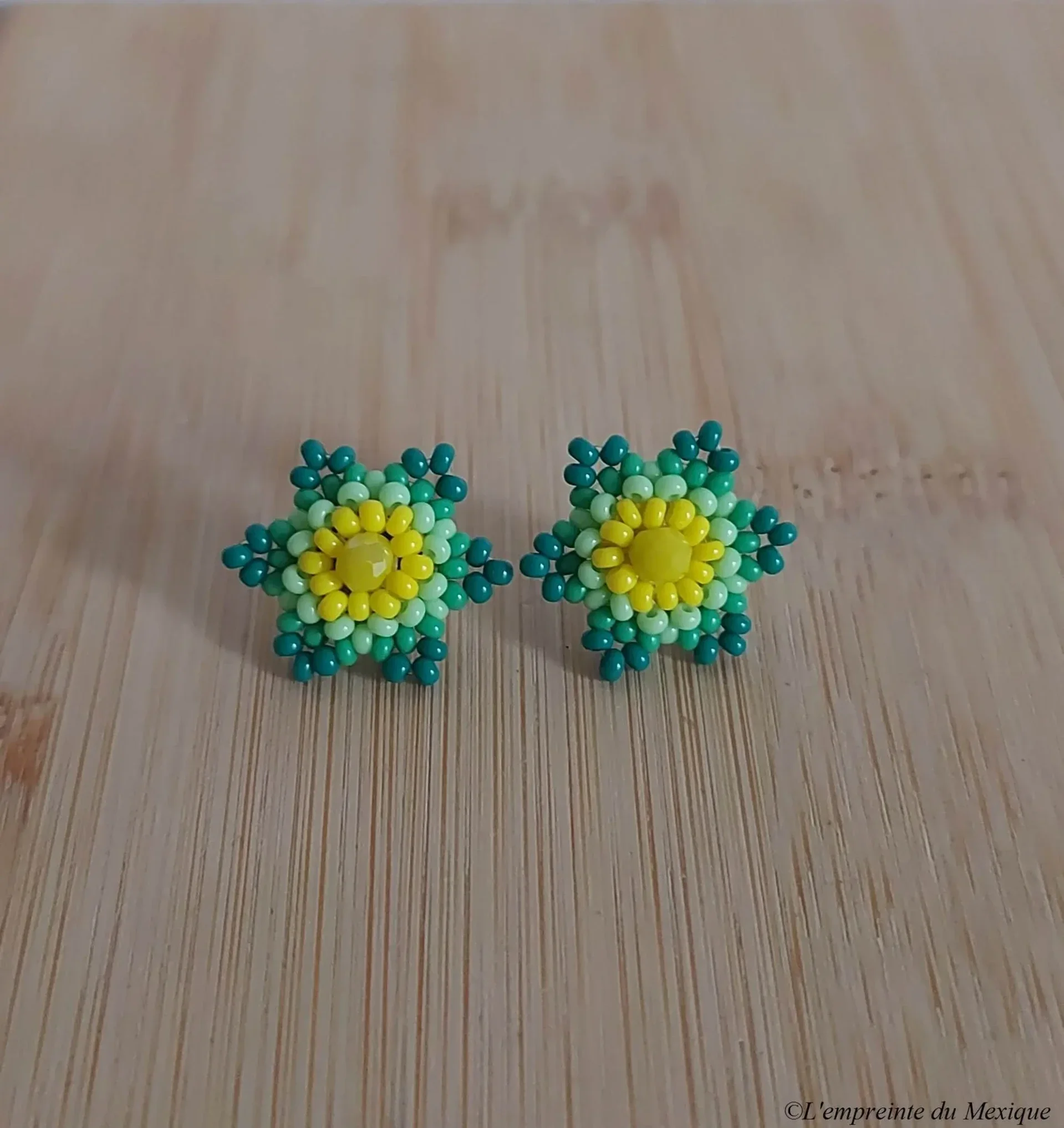 Boucles d’oreilles petites fleurs de peyotl vertes en perles de chaquiras – Art Wixárika