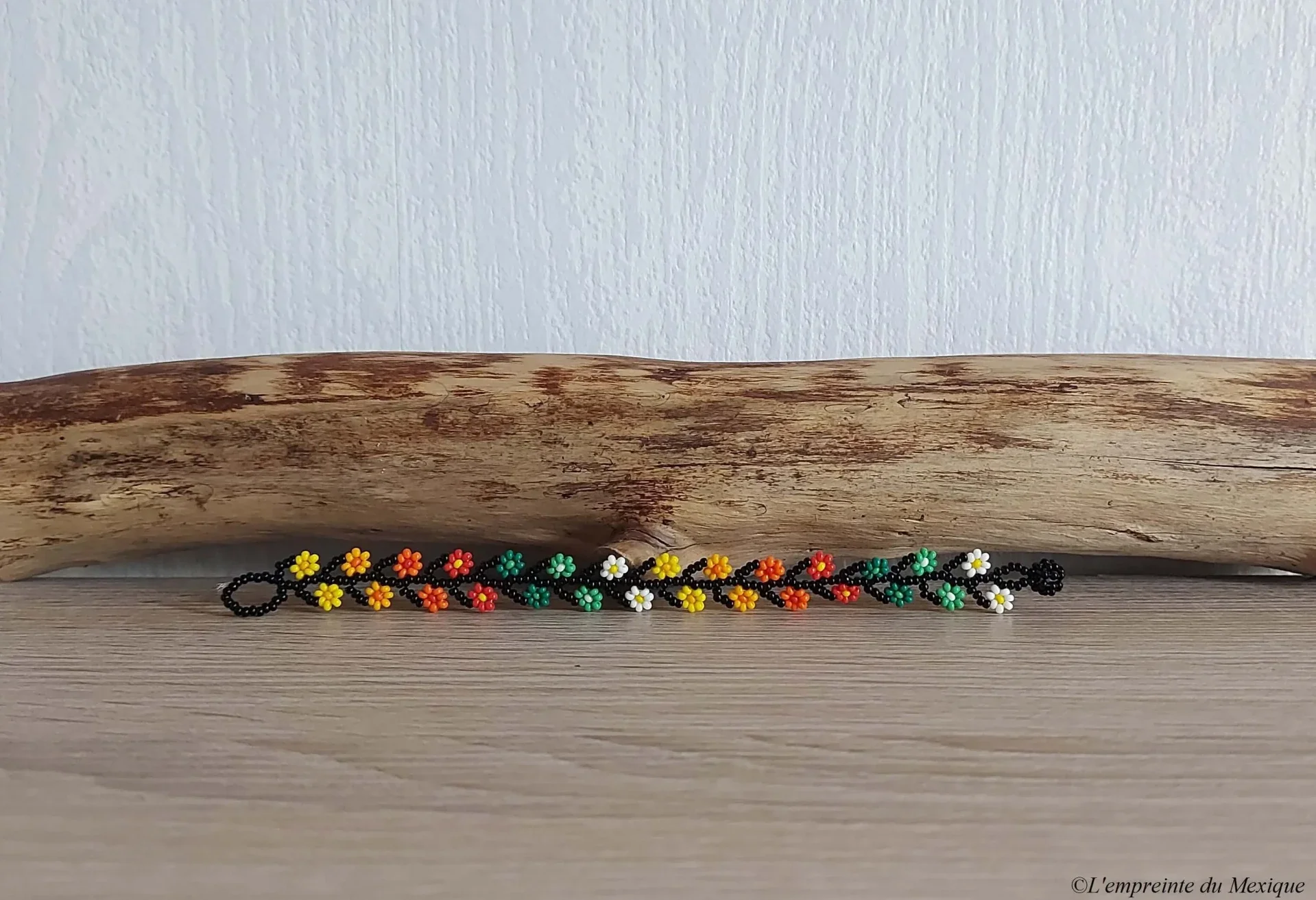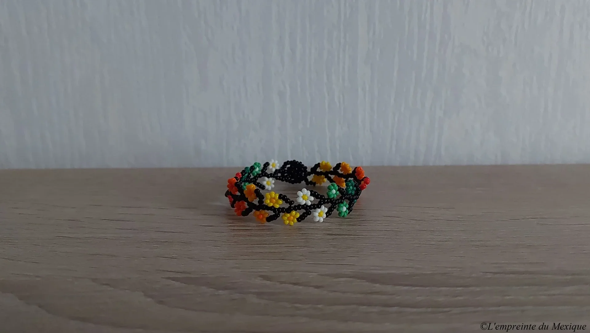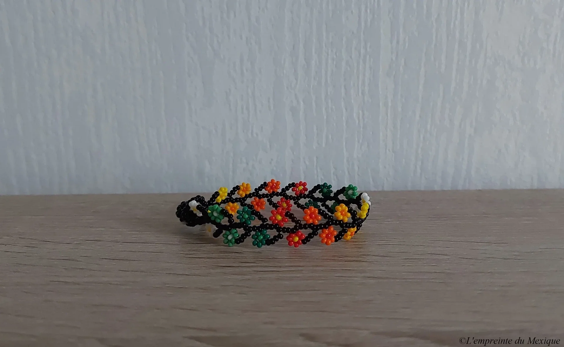 Ce bracelet délicat rend hommage au peyotl, élément central de la cosmogonie Wixárika (Huichol). Réalisé entièrement à la main par Elvia González Carrillo et sa famille, il se distingue par ses motifs floraux raffinés et ses nuances harmonieuses.