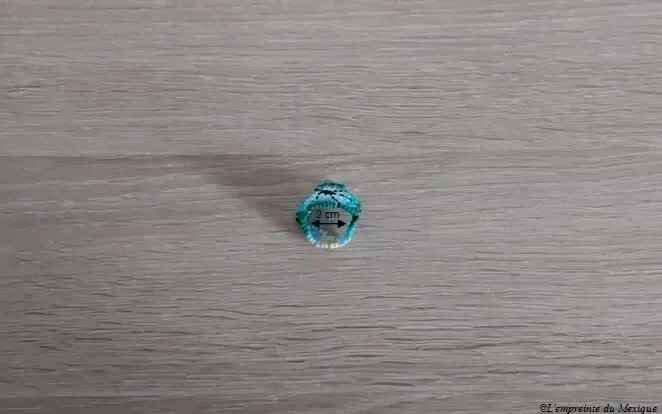 Cette bague fine tissée à la main en perles de chaquira présente une fleur de peyotl aux nuances bleues, blanches et vertes. Le peyotl est l’un des éléments les plus sacrés de la communauté Wixárika (Huichol).