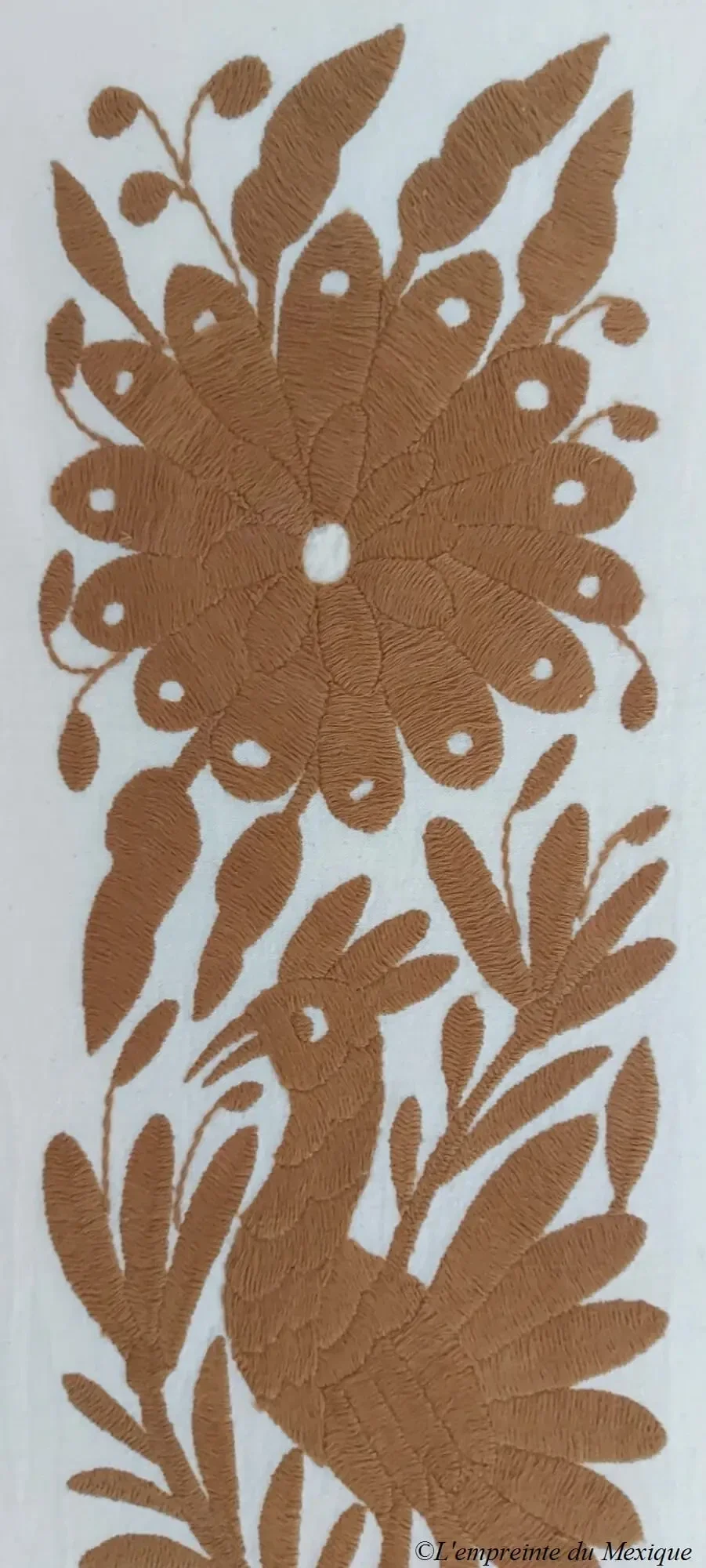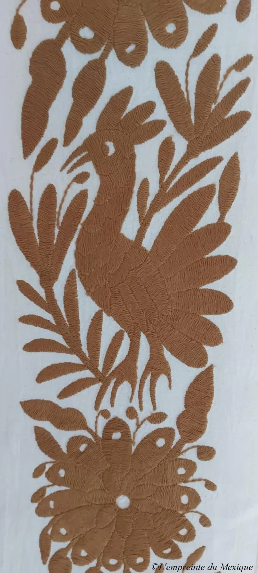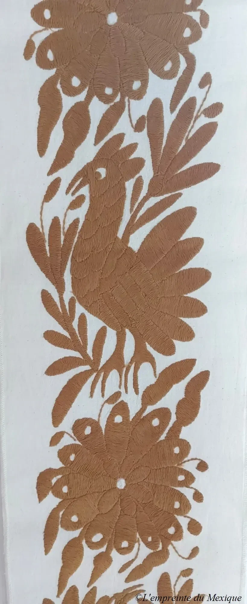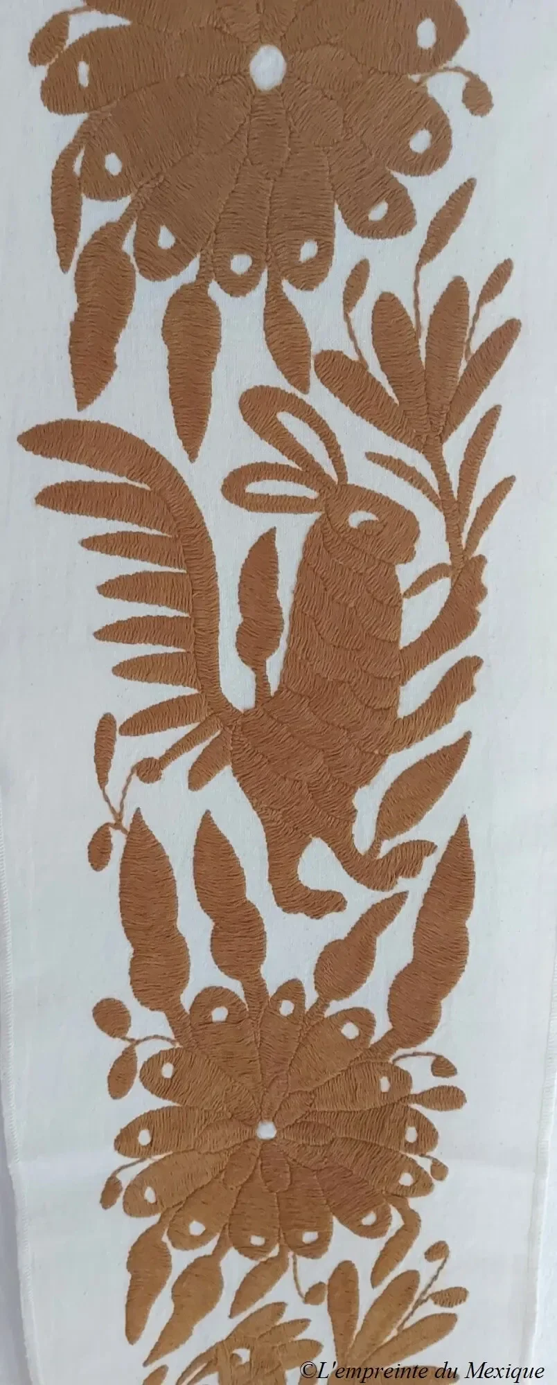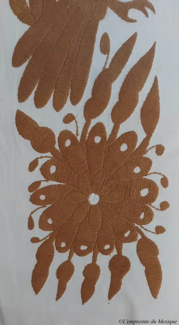 Élégant et vibrant, ce chemin de table doré est un chef-d’œuvre textile brodé à la main par Rebeca López Patricio (Bordando mis raíces), artisane originaire de la communauté Otomi de San Nicolás, dans l’État d’Hidalgo.
