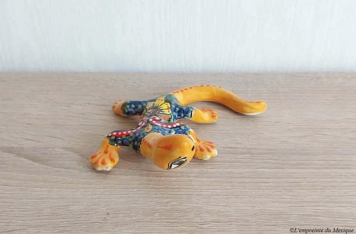Cette salamandre, réalisée et peinte à la main dans des couleurs chatoyantes, est une création de l’atelier Atahualpa Artesanías, symbole de l’artisanat mexicain.